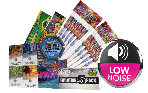 Experience the thrill of a stunning firework display without the loud noise. With our exciting Afterglow Low Noise display pack. This pack boasts a diverse range of colours, types and effects. Including cakes and barrages, fountains, roman candles. And small effect rockets. All without any loud bangs. It is ideal for young children at play schools. Nursery schools and retirement homes. As it provides an entertaining and colourful display while keeping the noise level to a minimum. To ensure a safe and enjoyable experience, follow the instructions on each firework. This is not only the best way. But also the safest way to set off your quiet firework display. Don't miss out on the opportunity to enjoy a magnificent firework display with your loved ones. While keeping the noise level low! So get ready to thrill your spectators with an amazing display of fireworks! Add excitement to your show with Roman Candles featuring spinning tails of glittering gold flurries and shiny golden tails with white strobing glitter flurries. For a mesmerizing effect, try the Catherine Wheel with its six colourful stages. The Fountains are a crowd-pleaser with vibrant red and blue dancing fish showering out. Then watch as the silver titanium flower crackles and explodes with eye-popping and vibrant dancing firefly effects. Don't forget the Barrages, which offer an array of stunning effects. And finally, launch Rockets that soar high into the night sky, leaving a trail of sparkling light behind. Like to see more low noise fireworks?