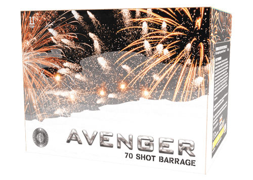 The Avenger has not been built into our fantastic platinum range for no reason. This is an excellent barrage offering. Silver blink mine rising to silver, red, green tails. With silver blink to white stars, blue stars to red blink. Green blink to gold willow. And silver blink to purple stars. from this 70 shot straight up barrage. The Avenger is a very busy cake. Which will Rapidly fire all 70 shots in approximately 35 seconds. A real sky filler, of noise and colour. This category 2 firework just bursts with quality. Which will have your gathering crowd thrilled. From the beginning until the end.
