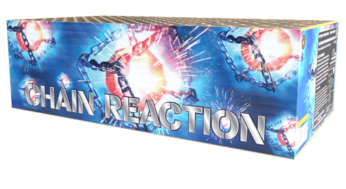 Trigger a Chain Reaction with this category 3 barrage. With a series of outstanding effects. Including a mixed firing pattern. With shots firing straight and angled. For instance super coloured tails heading to the skies. While scattering into bright blue stars. And silverfish. In addition to white strobe. With a red and green starburst. Likewise, lemon and blue stars with silver whistling tails fill the sky. While the vast variety of effects continues to keep giving. With scarlet red tails. To bright scarlet red strobes. With sea-blue pearls. While green tails reach high into the sky. Before bursting into purple stars. With a green strobe. With ever-increasing effects,