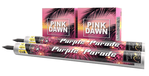 A pair of stunning 36 shot Cat. 2 professional style barrages, While opening with a pretty pink mine. To vibrant pink comet tails. With pink falling leaves. And finishes with a pink peony finale. With high-grade effects. Pink Dawn will blossom against the dark skies. Additionally included a pair of vibrant pink/purple colour stars tail. Offering