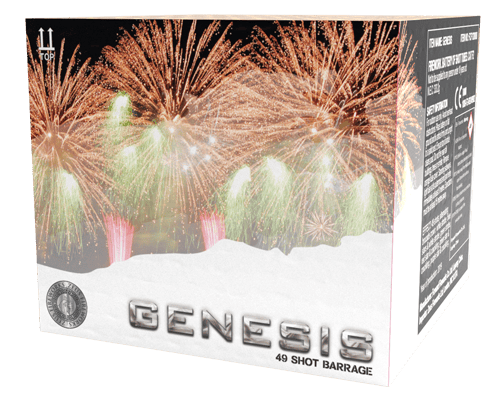 Genesis is from the Zeus platinum range. So this firework will deliver quality. A marvellous performer. Offering excellent duration. Spectacular effects. These include brocade crown and white strobe. Radiant blue stars and white strobe. Emerald green stars and crackling. Vivid purple stars and crackling. A great Cat 2 barrage with 49 shots. With a wonderful flurried finish. So add Genesis to your firework event to have your, spectators believing they're at a professional show.