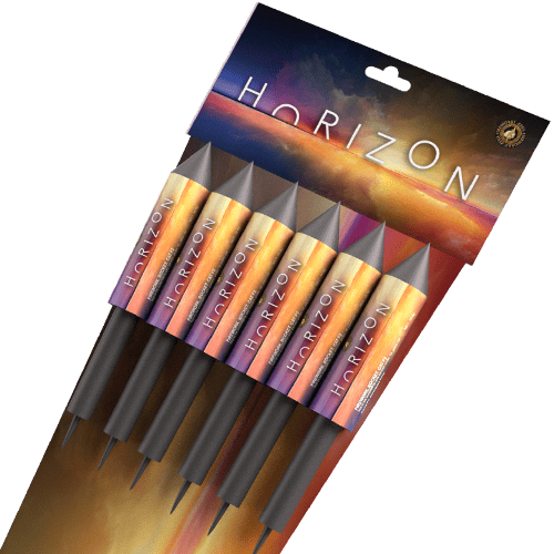 Our Horizon Rocket Pack offers six great rockets with sparkling effects. Including great variety and value for money. While these rockets will be great for any garden firework display. With a selection of effects with pink & white strobe. Brocade crown to red and blue Also red palm with a crackling flower. Gold chrysanthemum & blue stars, Including white strobe, green strobe & purple. This great small category 2 Horizon Rocket Pack. Requires your spectators to be at least 8 metres away.