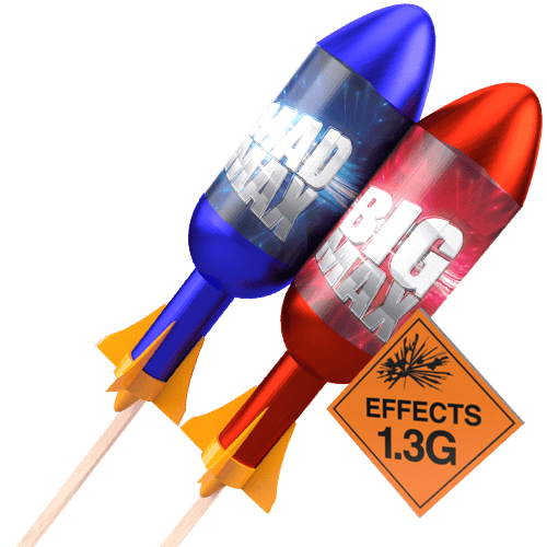 Mad Max and Big Max are not your average rockets. Crafted with proven professional display effects, these rockets guarantee an extraordinary performance that will leave you speechless.. The results speak for themselves as these rockets unleash an explosion of quality that is simply unparalleled.