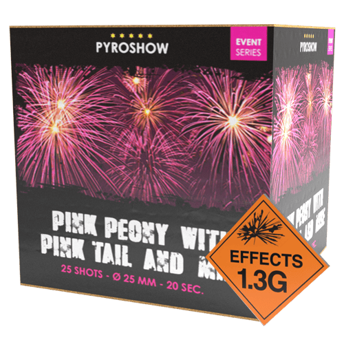 Pink is our new obsession. With the Pink Peony With Pink Tail And Mine barrage. From our professional effect range. While this brilliant 25mm big-bore barrage. Therefore fills the sky. With vivid pink cluster mines to bright pink tails. Before wonderful big pink peony stars fill the sky. In addition, it being a great firework for a gender reveal party. And would be a fantastic addition to any display. Despite the duration of only 20 seconds. This professional effects barrage fires 25 professional-style shots. In addition, this category 2 firework contains 370gms of explosive content. With a thumping 9 out of 10 noise level rating.