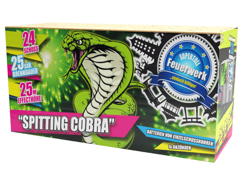 The Spitting Cobra is a small 24 shot barrage. And will strike from the start. With 24 striking effects. Filling the sky with big effects. With energetic red star tails. Breaking into silver and red peony stars. And then changing into purple tails. With purple and gold peony stars. Bright blue peonies. And gold strobes erupting out of the darkness. Then finally making way for. Pink stars and yellow strobes. This wonderful cake will add a bite of venom to your display. So set up the Spitting Cobra and enjoy this 24 shot barrage. So this barrage will soon have your crowd hissing with joy. And will last a very impressive 40 seconds. And The Spitting Cobra contains 180g of net explosive content. So we will be lighting up the skies with great sound and colour. This barrage is another Category F2 firework. Small but carries a venomous bite.