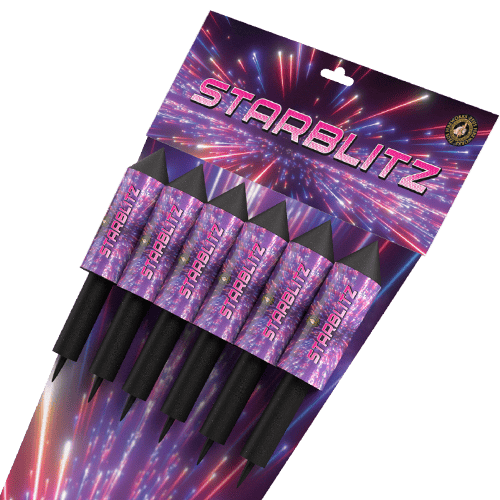 Launch our Starblitz Rockets. With each pack consisting of 6 wonderful rockets. Above all, they all come with different effects. As can be seen in the description. Including a green palm and a red strobe. With orange burst and green strobe. Brocade crown And white strobe. Also a gold strobe willow with blue stars. Purple dahlia & gold strobe. While not forgetting the gold palm with crackle. This great category 2 rocket pack is ideal for any display and requires a minimum safety distance of 8 metres. While each of the Starblitz Rockets contains a net explosive content of 19 gms. And who doesn't love the sound of a rocket soaring into the dark skies? Meanwhile, check out our